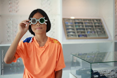 Child wearing eyeglasses for medical eye test in clinic , eye exam, eye test concept, kid eye test