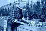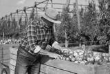 Senior man standing next to big box full of apples