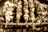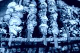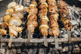 Delicious kebab roasting in fire pit close up. Meat and vegetable bbq grilling in smoke in modern fireplace pit. Summer picnic outdoor. 4 of july