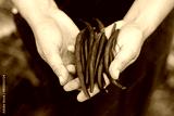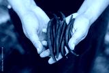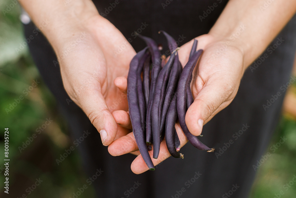 Farmer hands holding purple beans close up. Homestead lifestyle. Gardening and growing vegetables in urban organic garden