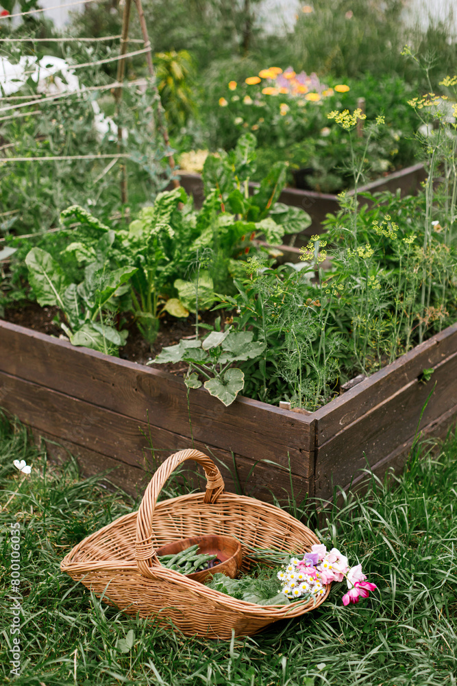 Vegetables, chard leaves, beans and flowers in wicker basket on background of raised garden bed. Harvesting vegetables and greens in urban organic garden. Homestead lifestyle