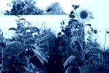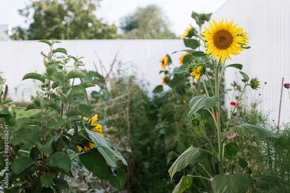 Beautiful sunflowers on background of raised garden beds with vegetables in urban organic garden. Homestead lifestyle. Wild community garden