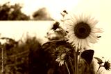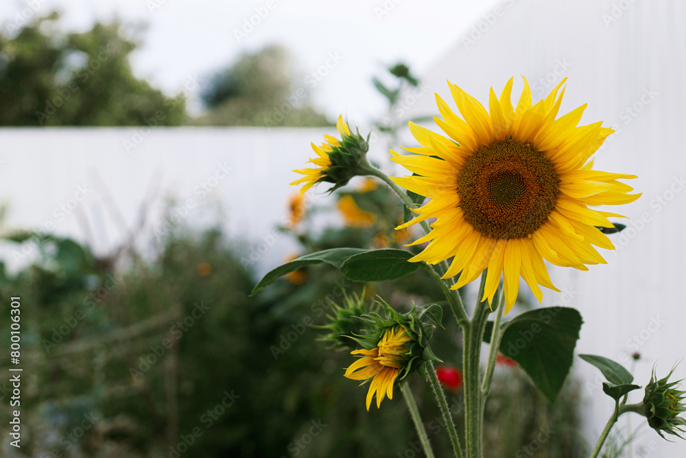 Beautiful sunflowers on background of raised garden beds with vegetables in urban organic garden. Homestead lifestyle. Wild community garden