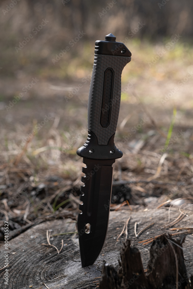 Hunting knife on a stump in the forest. Selective focus.