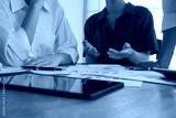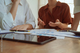 A group of professional businesswomen engaged in a collaborative meeting in a modern office setting. Concentrated and smiling, they discuss ideas and plans for successful teamwork