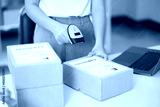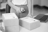 Young business online woman scanning package label with barcode reader at storehouse.