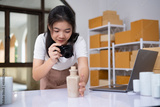 Young Asian business entrepreneur using a compact digital camera take a photo of product for upload to website online shop.