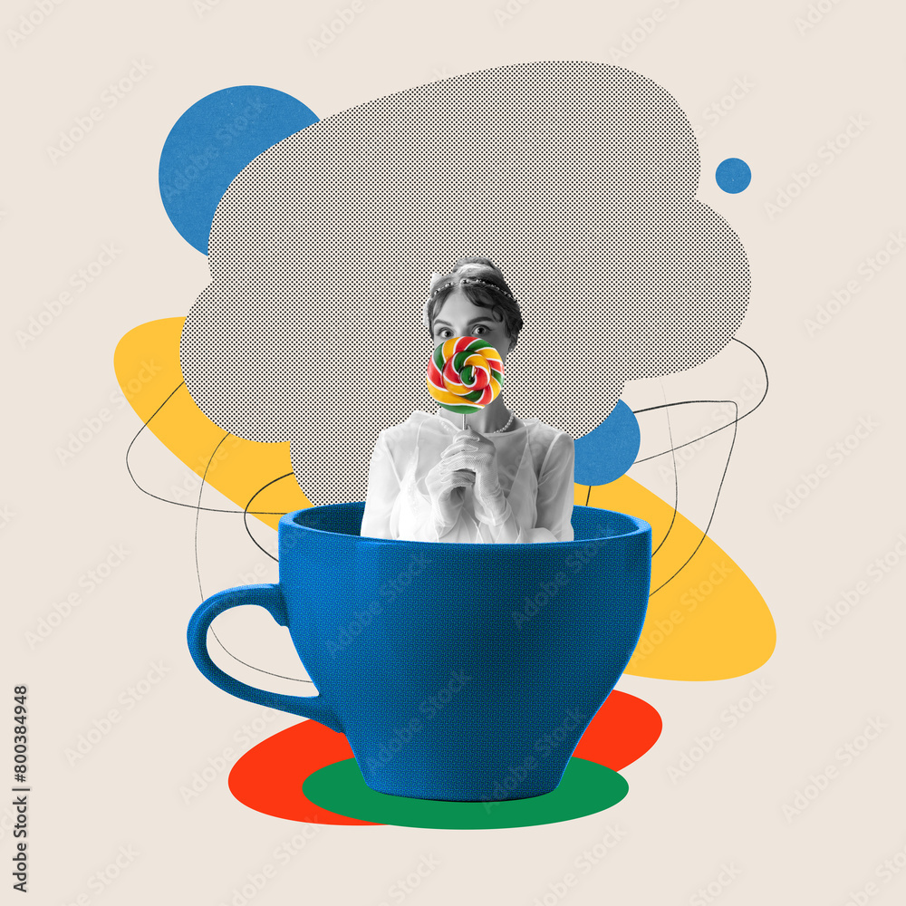 Elegant young woman, medieval princess sitting inside cup with lollipop on abstract colorful background. Contemporary art collage. Concept of creativity, comparison of eras, surrealism, inspiration