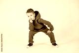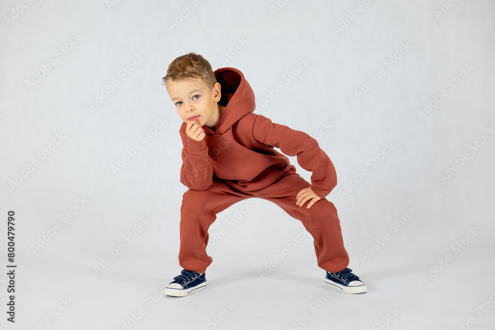 Little boy in hip hop dance position.Little boy model. Little boy in brown tracksuit on white background.