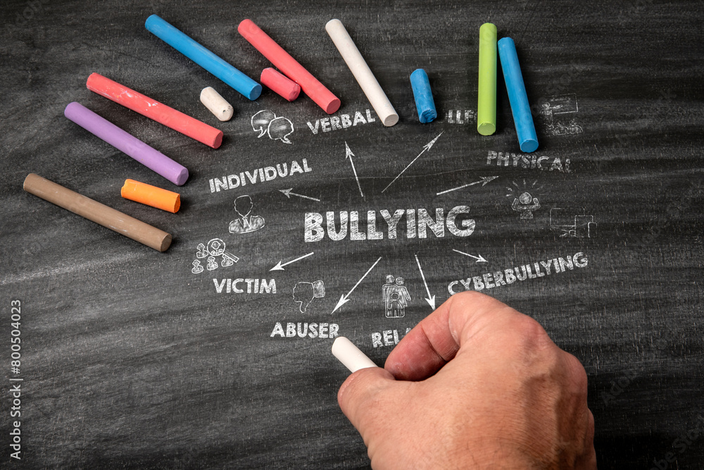 Bullying. Verbal, Collective, Cyberbullying, Mobbing and Victim concept. Black scratched textured chalkboard background
