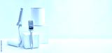 Geometric podium or pedestal with paint can, brush, sponge roller on a white background. Mock up for displaying works
