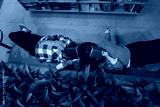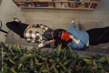 Two people lying relaxed on a bench in an indoor lounge, surrounded by plants, immersed in reading books. Calm and serene environment captured in an urban setting.