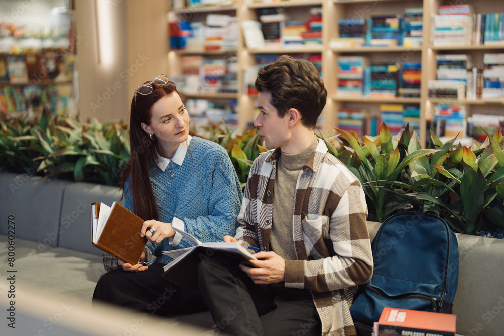 A young man and woman sit comfortably in a modern bookshop, surrounded by books, deeply engaged in a conversational exchange. Their expression shows interest and thoughtfulness.