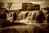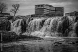 Dramatic sunset at Falls Park in Sioux Falls, South Dakota, USA, Big Sioux River water falling over quartzite and pipestone rock formations
