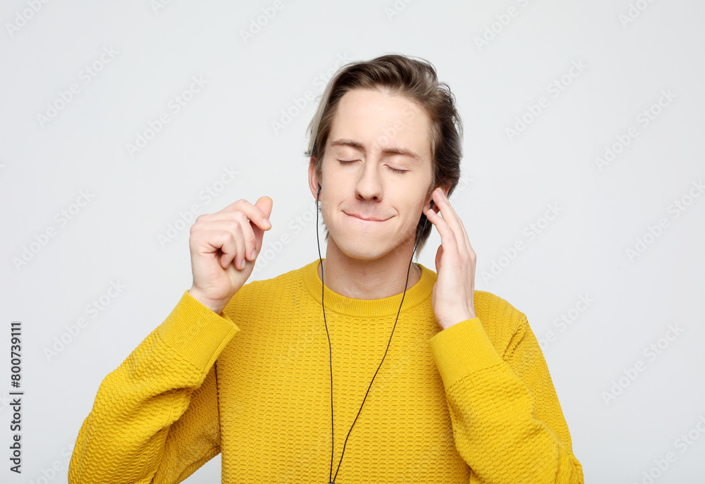 Stylish young man wearing yellow sweater with headphones dancing to the music