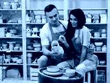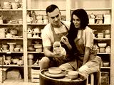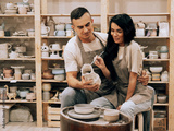 A young smiling couple works in a pottery workshop. Painting a vase. The concept of hobbies