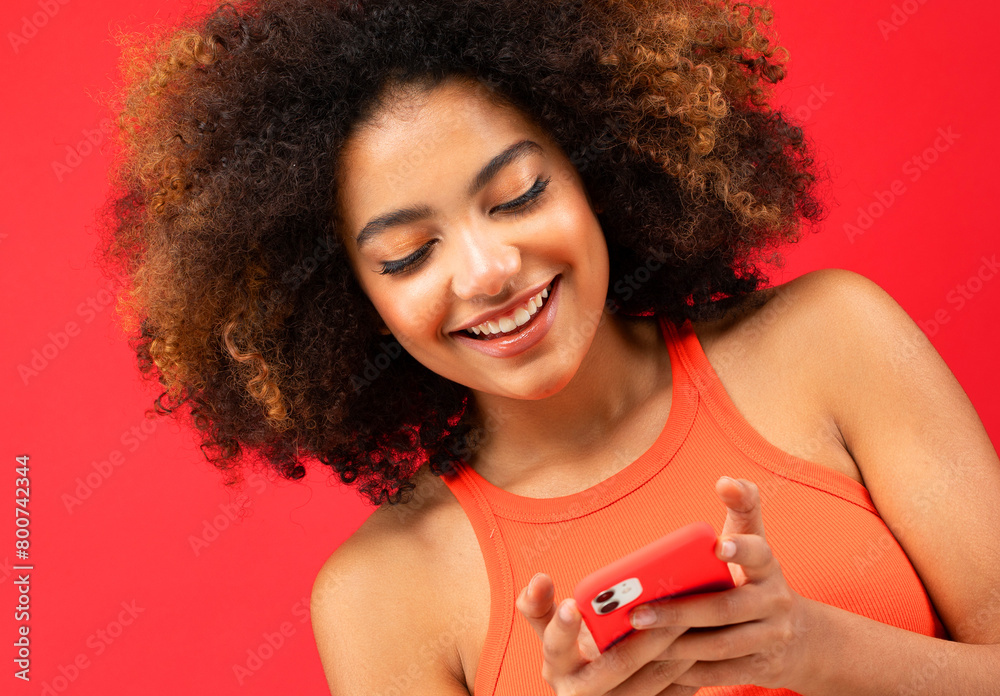 ethnic woman holds modern mobile phone, uses electronic device on surfing web, connected to wireless internet