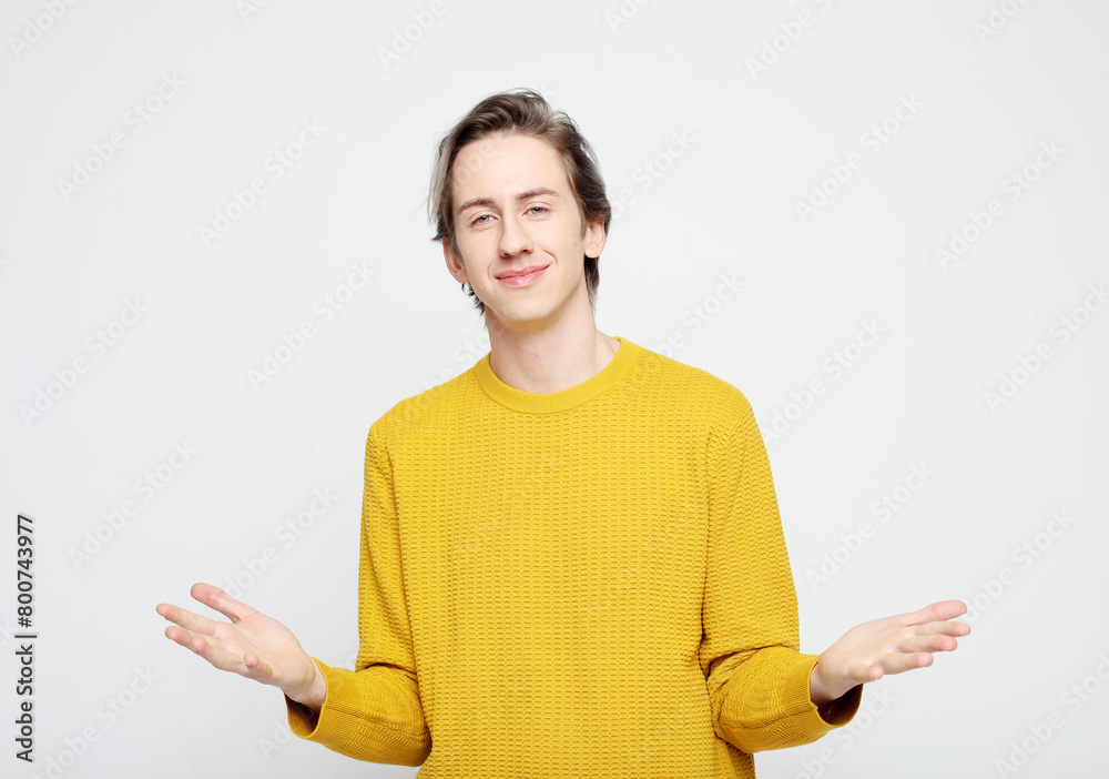 A man in a yellow sweater raises his arms to the sides in surprise, a gesture of amazement.