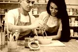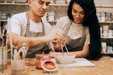 A young smiling couple works in a pottery workshop. Painting a vase. The concept of hobbies