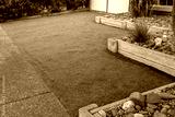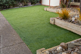 A front yard garden with artificial grass, wooden or timber edging, and decorative rocks. Ground covered by synthetic turf.