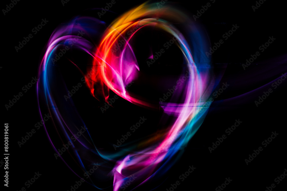 Light colorful heart shape on black background. Long exposure. Light painting photography.