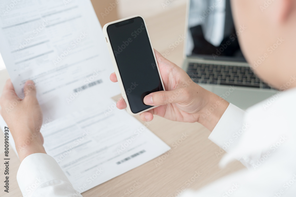 business man use phone to scan barcode or QR codes to pay credit card bill after receiving document invoice online. payment, receive, paying electricity, digital payments without money, technology