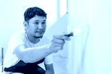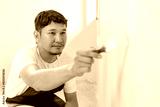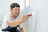 painter man, brush in hand for products to restore and paint the wall, indoor the building site of a house, wall during painting, renovation, painting, contractor, Architect, construction worker.