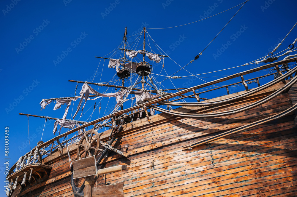 mast with sails on an ancient wooden pirate ship boat on background of blue sky in the sea