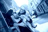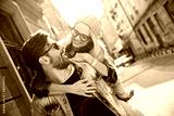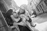 Happy young couple piggyback riding and laughing in urban setting