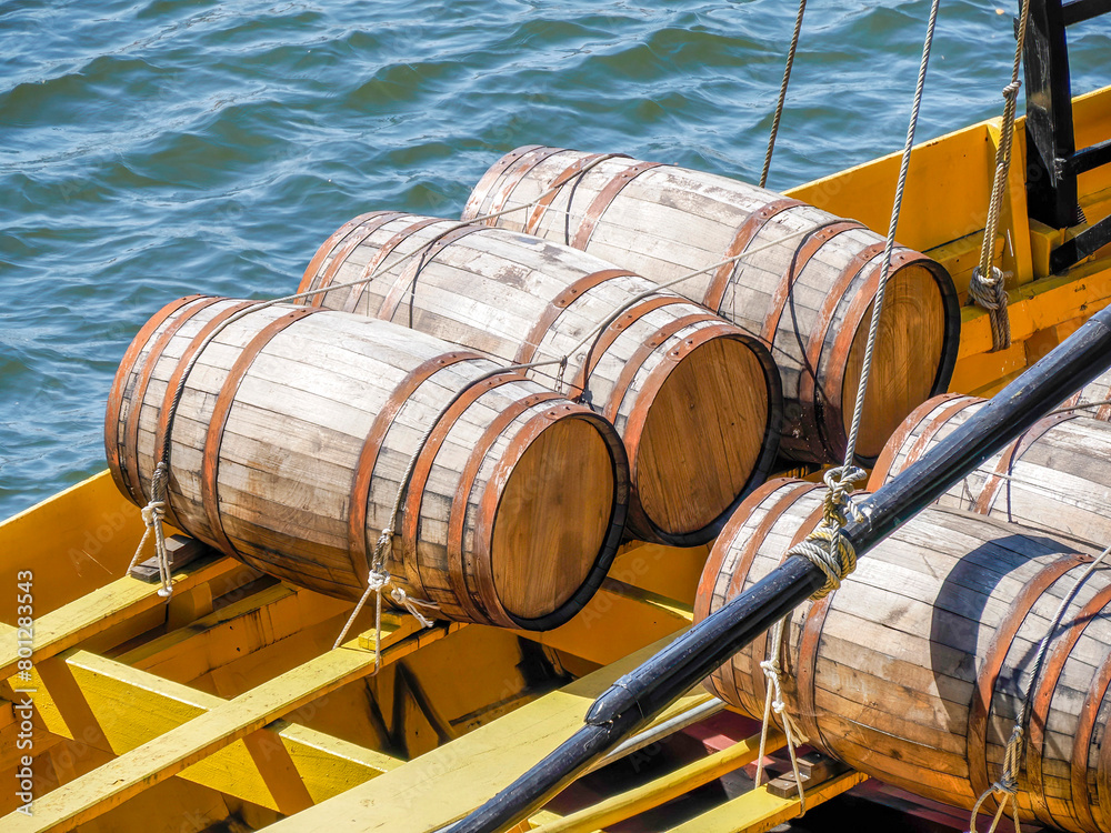 boat with wine barrels ribeira Porto old town street view building, portugal on the Douro River