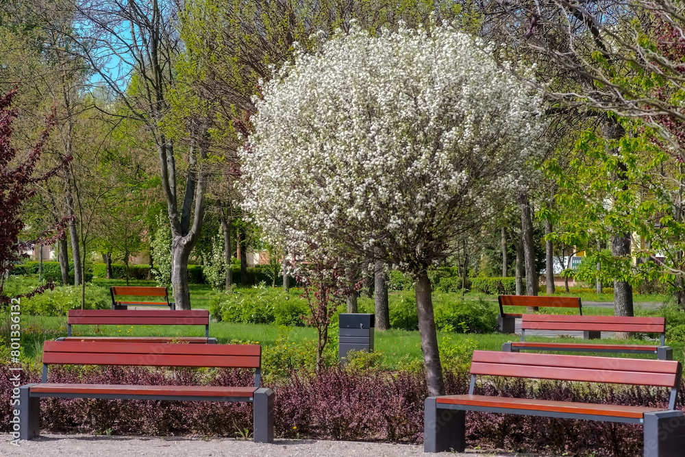 Mały park w mieście na wiosnę. Zielony zakątek wśród osiedla apartamentowców. Kwitnące drzewa, zielona trawa, ławki i brukowane ścieżki w małym parku.