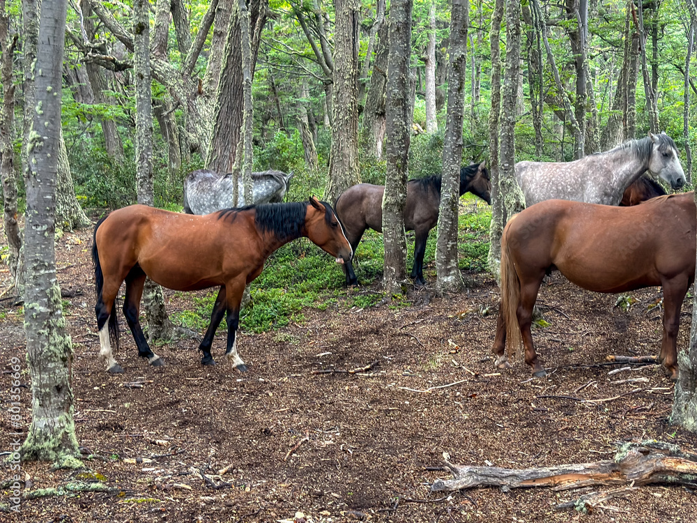 Wild horses in Tierra del Fuego National Park outside Ushuaia in the Beagle Channel, Tierra del Fuego, southern Argentina