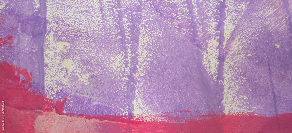 Messy paint strokes and smudges on an old painted wall. Pink, purple color drips, flows, streaks of paint and paint sprays on white wall background