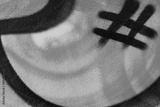 Abstract wall surface with part of graffiti. Blue and black geometric lines on grunge white background.