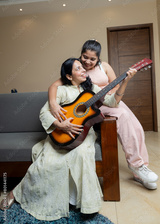 Indian Young Teenage Daughter Helping mother with Guitar Playing at home sitting on sofa, Mother Daughters Relation ship