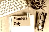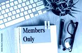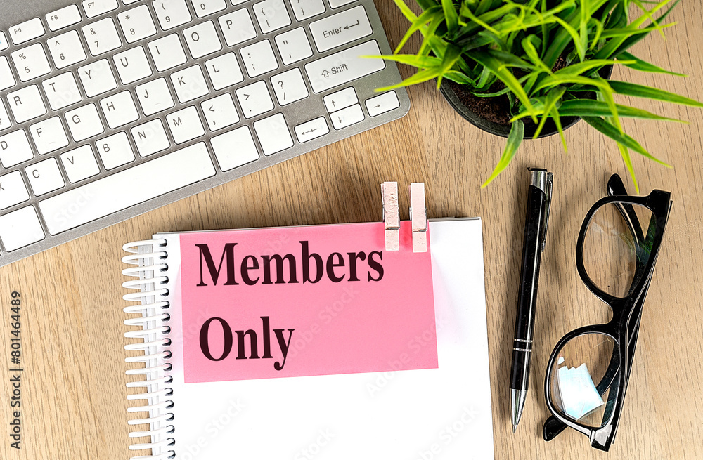 MEMBERS ONLY text pink sticky on notebook with keyboard, pen and glasses