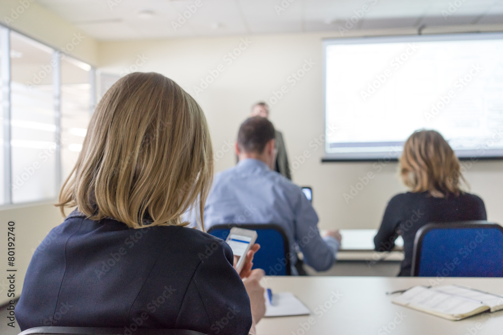 close up rear view of the woman watching mobile in a class
