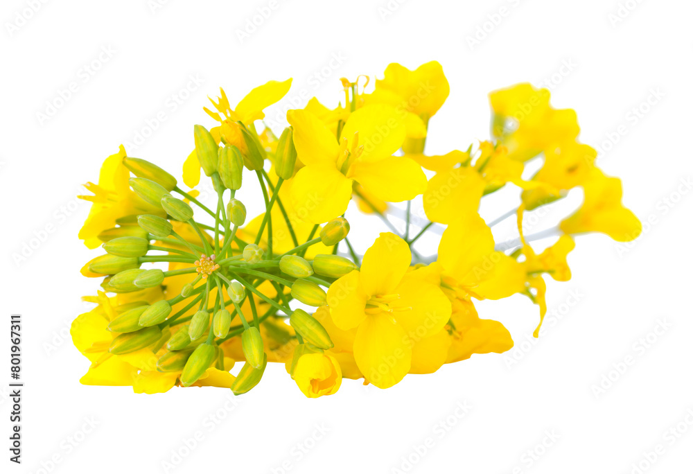 A close-up of bright yellow canola flowers, showcasing their delicate petals and green stems, isolated on a white background. PNG