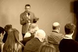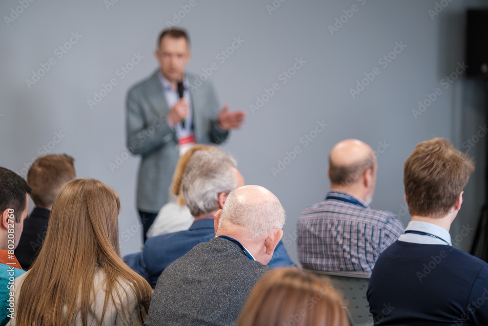 Dynamic business speaker addresses an attentive audience in a well-lit conference room, sharing insights and inspiring professionals.