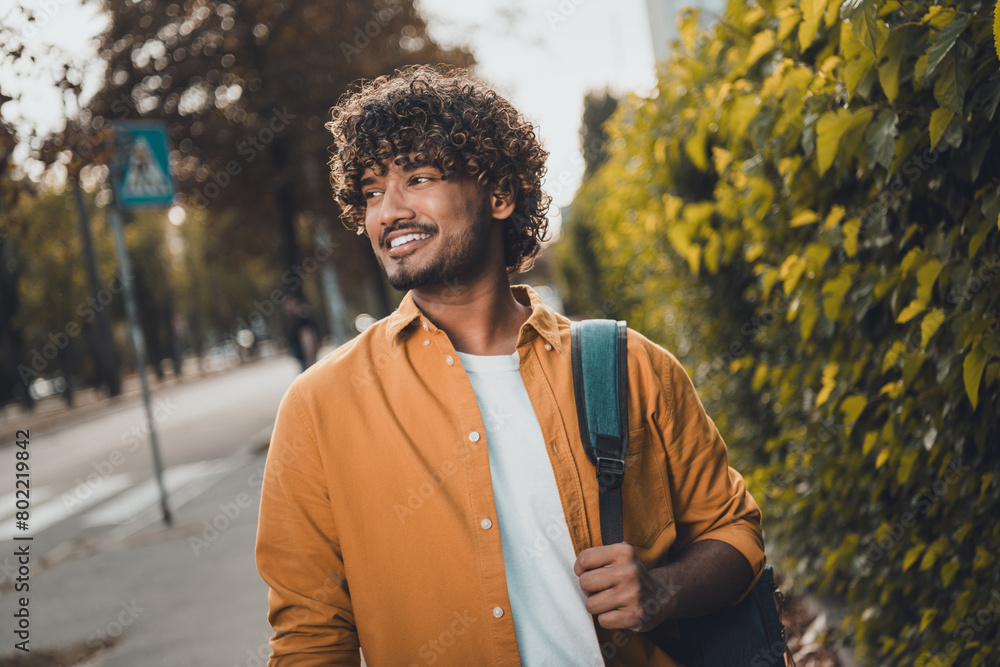 Photo of cheerful indian man wearing stylish clothes going home after college lectures nice sunny weather outside