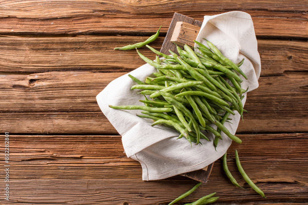 Fresh young beans pods. Old wooden background. Green string beans crop conception