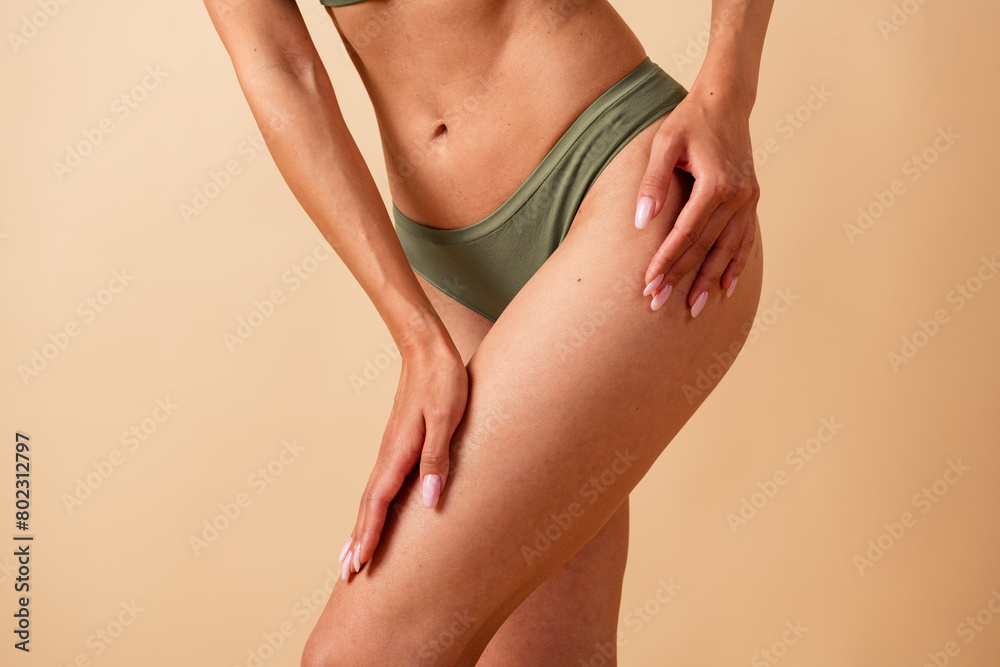 Cropped photo portrait of pretty young girl touch hips legs no filter dressed stylish khaki underwear isolated on beige color background