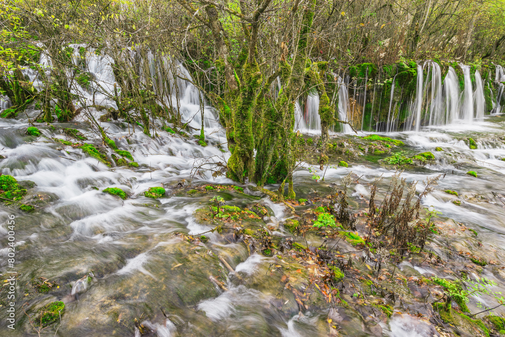 Autumn view of the waterfall. Jiuzhaigou nature reserve. Jiuzhai Valley National Park.