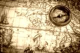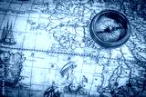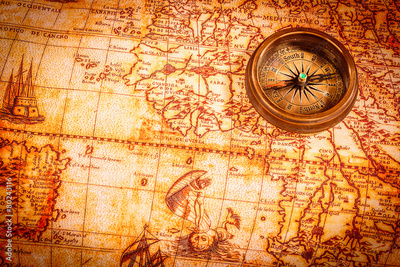 Vintage compass lies on an ancient world map.