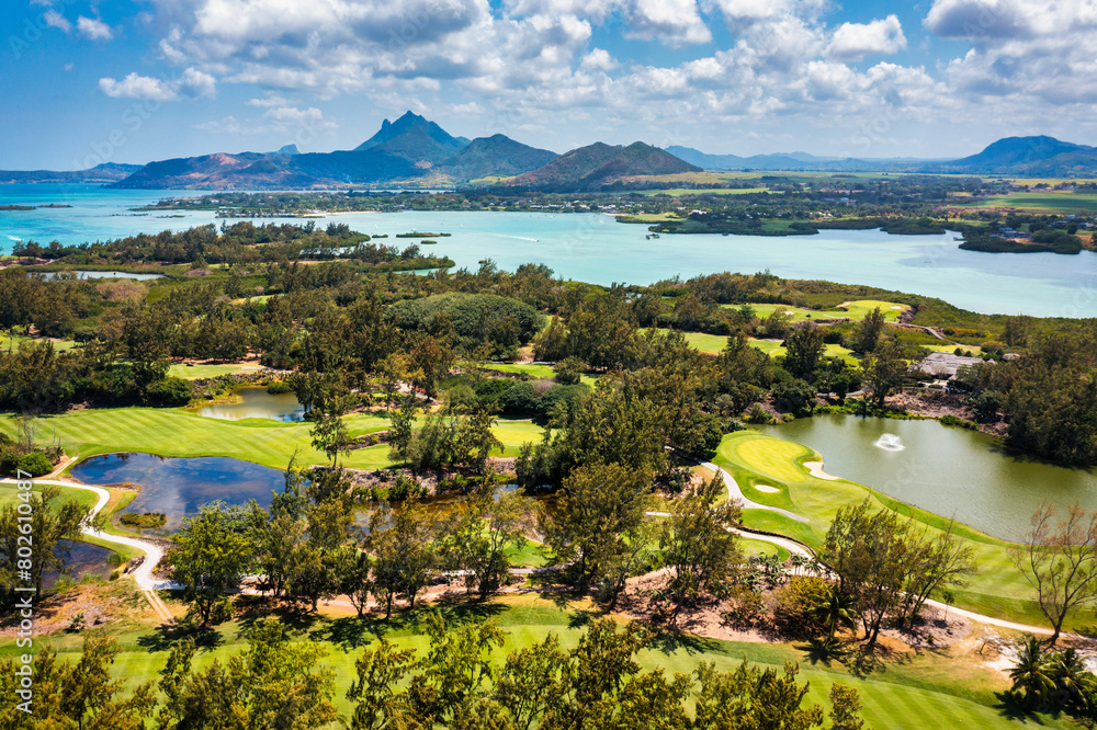 Ile aux Cerfs island with idyllic beach scene, aquamarine sea and soft sand, Ile aux Cerfs, Mauritius, Indian Ocean, Africa. Ile aux Cerf in Mauritius, beautiful water and breathtaking landscape.
