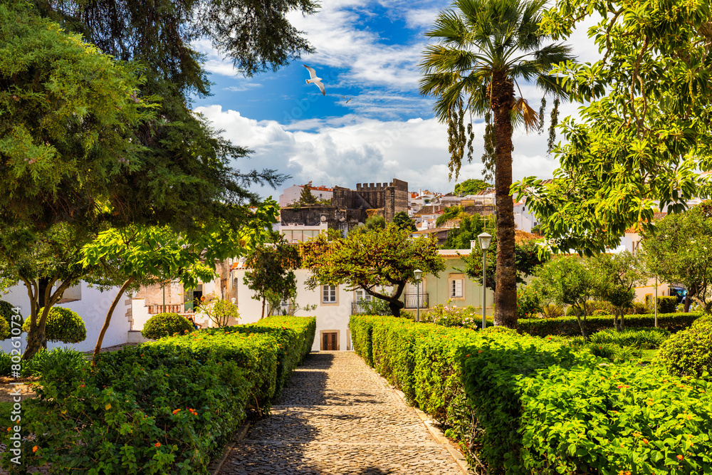 View of the city of Tavira, charming architecture of Tavira, Algarve, Portugal. Santiago of Tavira church in the old town of the beautiful city of Tavira in a sunny day. Algarve region, Portugal