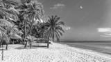 Paradise beach resort with palm trees and and tropical sea in Mauritius island. Summer vacation and tropical beach concept. Sandy beach with Le Morne beach on Mauritius island. Tropical landscape.