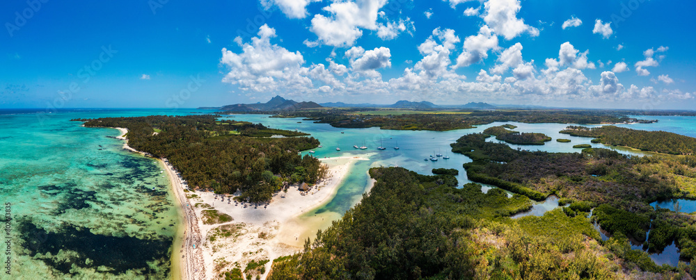 Ile aux Cerfs island with idyllic beach scene, aquamarine sea and soft sand, Ile aux Cerfs, Mauritius, Indian Ocean, Africa. Ile aux Cerf in Mauritius, beautiful water and breathtaking landscape.