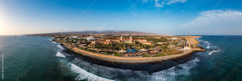 Aerial drone of the popular resort town of Meloneras, with hotels and restaurants, near the Maspalomas dunes in Gran Canaria, Canary Islands, Spain