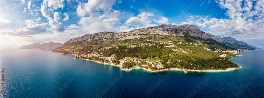 Beautiful Brela on Makarska riviera, Croatia. Adriatic Sea with amazing turquoise clean water and white sand. Aerial view of Brela beach and waterfront on Makarska riviera, Dalmatia region of Croatia.